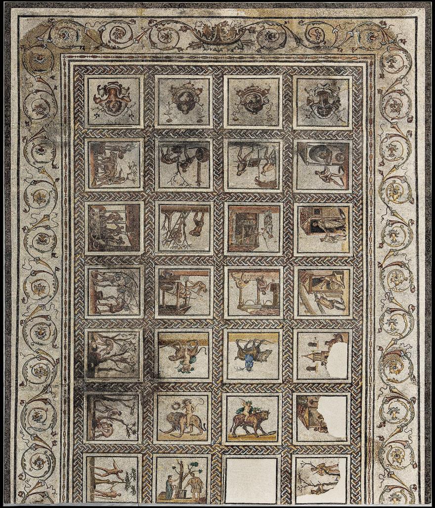 The mosaic, over a third of which is missing, decorated the floor of a large suburban villa in Saint-Romain-en-Gal, one of the areas of Vienne in ancient times. It was one of the most beautiful and most prosperous towns in Gaul. Mosaic workshops were set up in Vienne to satisfy the demands of a wealthy clientele.Agricultural and rural activities, and the festivals of the four seasons are depicted in 40 panels surrounded by a rich braided border. 27 of these survive, each measuring 59 cm. This theme was not generally used by mosaicists, and particularly not by the workshops of Vienne, which preferred to depict mythological scenes or still lifes. They were inspired no doubt by one or several of the Roman examples found throughout the Mediterranean region, but this mosaic could also well be regarded as a “reportage” on Gallo-Roman agricultural practices.The images are set around four central panels depicting personifications of the seasons: Winter is a woman wrapped in a cape on a wild boar, Spring is a nude Cupid on a bull, Summer is a nude Cupid on a lion, and Autumn is a nude Cupid on a tiger.