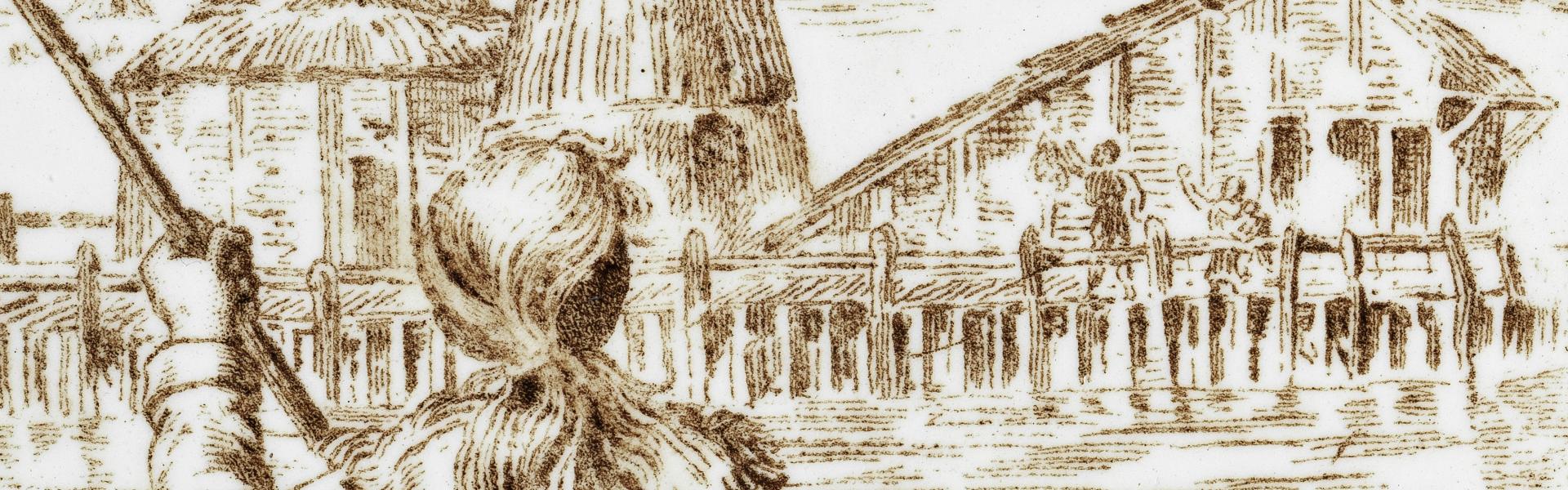Produites de manière industrielle, ces assiettes sont des objets bon marché. Leur décor est obtenu par transfert d’une image gravée, imprimée sur la faïence fine émaillée, puis fixée par une deuxième cuisson. La facilité de fabrication permet d’épouser l’actualité. Ici, le graveur des illustrations, Charles Hamlet, a adapté des dessins de Garnier, diffusés par une brochure vendue en 1889.